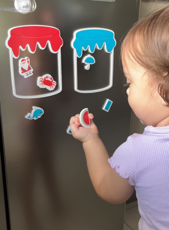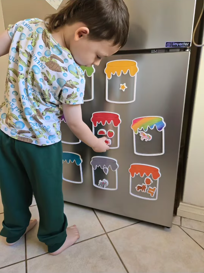 Sid absolutely loved setting this up & sorting the colours out. He went through and named the colour each time, and the object, obviously with some help. I love that I could take the pots off, mix the magnets up and pop the pots back on for a quick reset!